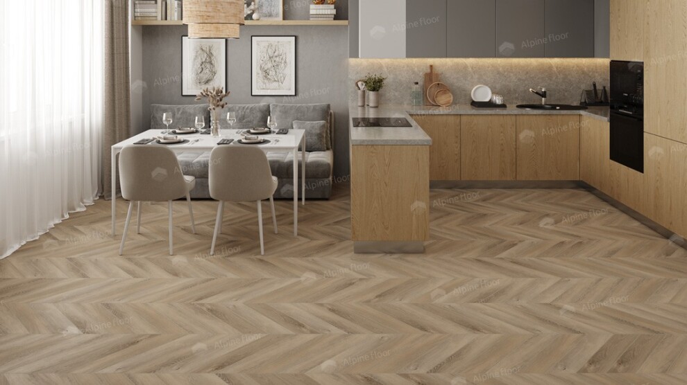 Кварц-виниловая напольная плитка Дуб Синистра Chevron ECO 20-6 коллекция плитки Альпийский шеврон LVT купить в Москве от производителя Alpine floor. LVT плитка Дуб Синистра Chevron ECO 20-6 — калькулятор расчета, скидки, фото в интерьере. Доставка по Москве и России.
